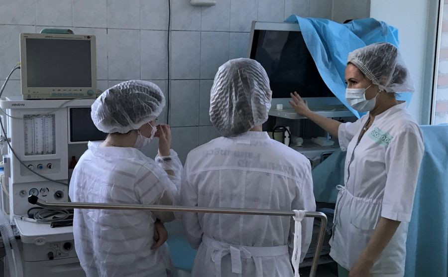 Пока одни ребята примеряют на себя роль хирургов, другим проводит экскурсию старшая операционная сестра Елена Гаряева. Она показывает высокотехнологичное современное оборудование, полученное по программе модернизации первичного звена здравоохранения, — оно позволяет проводить максимально щадящие хирургическое и травматологические операции, ранее недоступные пациентам районных больниц.