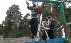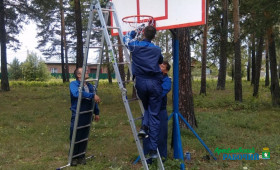 Волонтеры реконструировали два баскетбольных кольца и обновили (покрасили) находящиеся здесь турники.