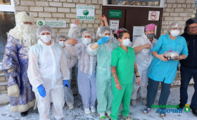 Теплые слова, веселая музыка наполнили атмосферу радостным предвкушением Нового года. В пляс пустились и медики, и гости, что пришли их поздравить. Несмотря на почти двадцатиградусный мороз у ковид-госпиталя стало жарко.