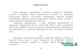 1.Всем офицерам, прапорщикам, мичманам, сержантам, старшинам, солдатам и матросам запаса, проживающим постоянно на территории Свердловской области, получившим персональные повестки военных комиссариатов районов (городов) Свердловской области, явиться в сроки и пункты, указанные в персональных повестках.