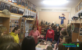 У мемориального комплекса в фойе отдела, руководитель музея полиции Эльфира Никитина рассказала ребятам о сотрудниках, погибших при исполнении служебных обязанностей, в музее познакомила с историей полиции. Студенты с интересом рассматривали экспонаты, связанные с Великой Отечественной войной и историей различных служб.