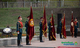 В ходе мероприятия состоялся торжественный вынос на Площадь Обороны Знамён Победы, олицетворяющих боевую и трудовую славу свердловских предприятий и организаций, – ведь именно Урал в годы войны стал столицей тыла, снабжая фронт всем необходимым, – от одежды и обуви до крупногабаритной техники. В числе предприятий, чьи знамёна были вынесены на Площадь Обороны, – Уральский оптико-механический завод им. Э.С. Яламова, чьи изделия поставлялись в бронетанковые, артиллерийские войска и на морской флот; предприятие «Пневмостроймашина», в кратчайшие сроки наладившее производство на базе эвакуированного из Москвы Аэротехнического завода; Уральский компрессорный завод, который с 1942 года производил миномётное вооружение и легендарные «Катюши» и многие другие.