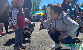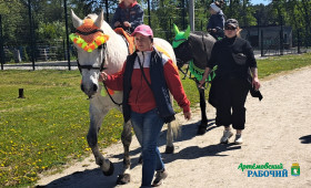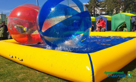 Дети катались на лошадях, на карусели, в больших надувных шарах по водному бассейну, прыгали на батутах и соревновались, как одни, так и с родителями.