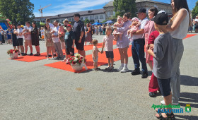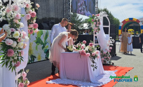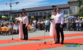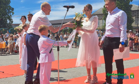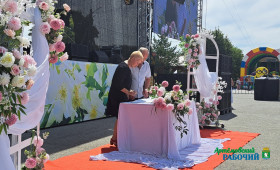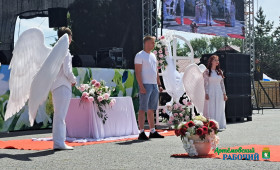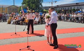 А затем подошла очередь очень ответственной и волнительной части торжества — бракосочетание двух пар, прямо на площади Советов, на глазах многочисленных жителей. Как сообщили ведущие, в 2024 году брак заключили 120 супружеских пар. В этот раз все собравшиеся стали почетными свидетелями создания новых семей — Холманских и Старцевых.