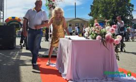 Чествовали в этот день и золотых юбиляров. Люди, прожившие полвека вместе, сумевшие доказать свою взаимную любовь — супруги Топорковы и Автайкины. Они внесли свои подписи в Книгу юбиляров семейной жизни. А затем, держась за руки и смотря друг другу в глаза, мысленно повторяли слова клятвы, скрепив свой брак поцелуем. Их поздравил Евгений Старков, подарив букеты красных роз.