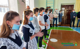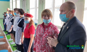 Ребята встречали легендарного биатлониста торжественно: в зале построились юнармейский отряд «Кречет» и лучшие спортсмены школы. А вместе с гостем приехали глава АГО Константин Трофимов, председатель Думы Владимир Арсенов, другие руководители.